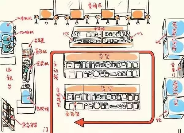 這樣擺放貨架,會自然形成一個映帶顧客向右側行走的主通道,貨架之間還留有多個副通道,非常符合人們平時的購物習慣。