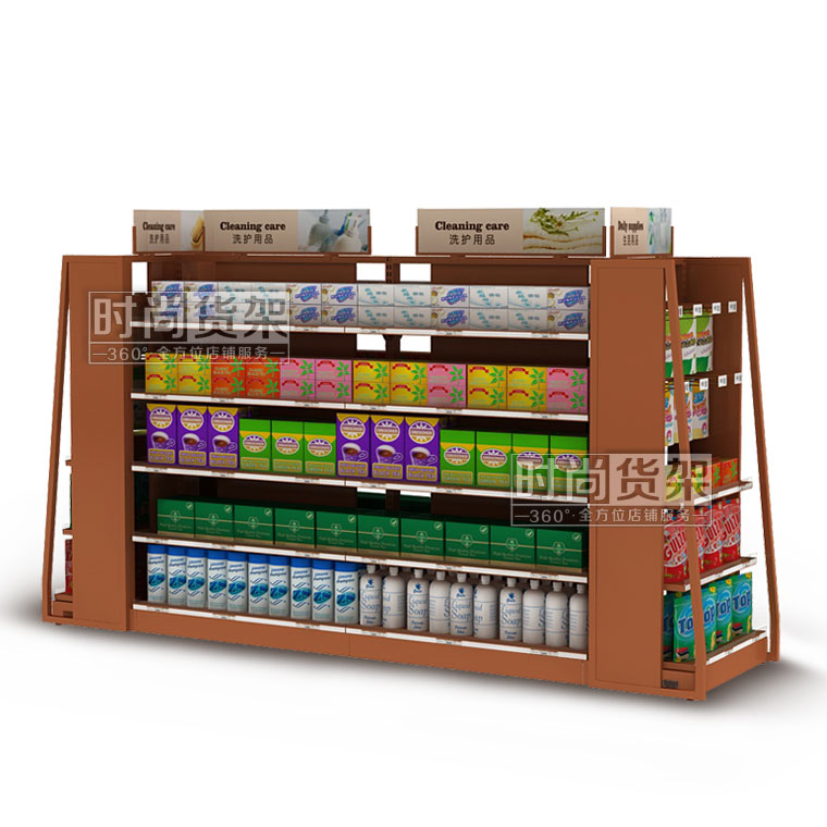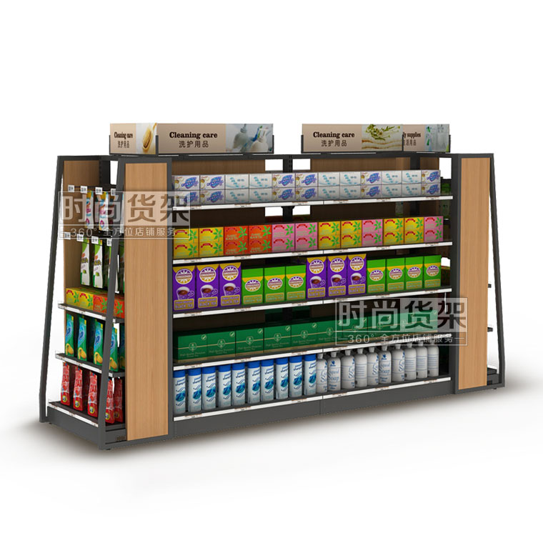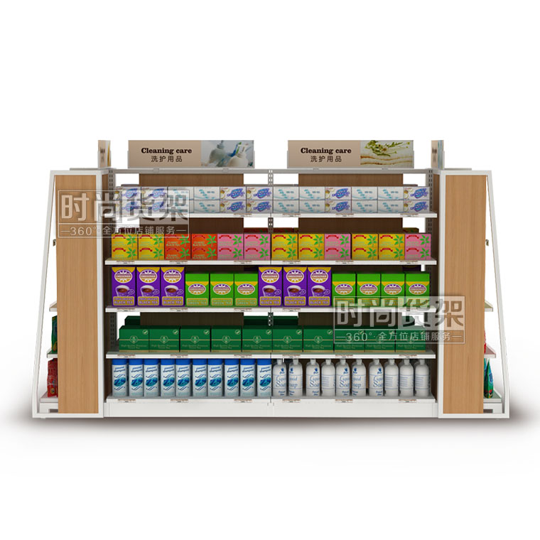 【描述】本款洗護用品中島貨架采用鋼木結合的結構,先進工藝冷軋鋼,表面具有耐磨防刮的效果,有白色、灰色、咖啡色三種顏色選擇。配以白橡木制側板、背板,均采用高密度木板制作而成,材質環保,用料扎實,彰顯木質樸實自然的質感。此款日用品貨架適用于多種裝修風格,時尚高檔,是中高端連鎖便利店的品質首選。