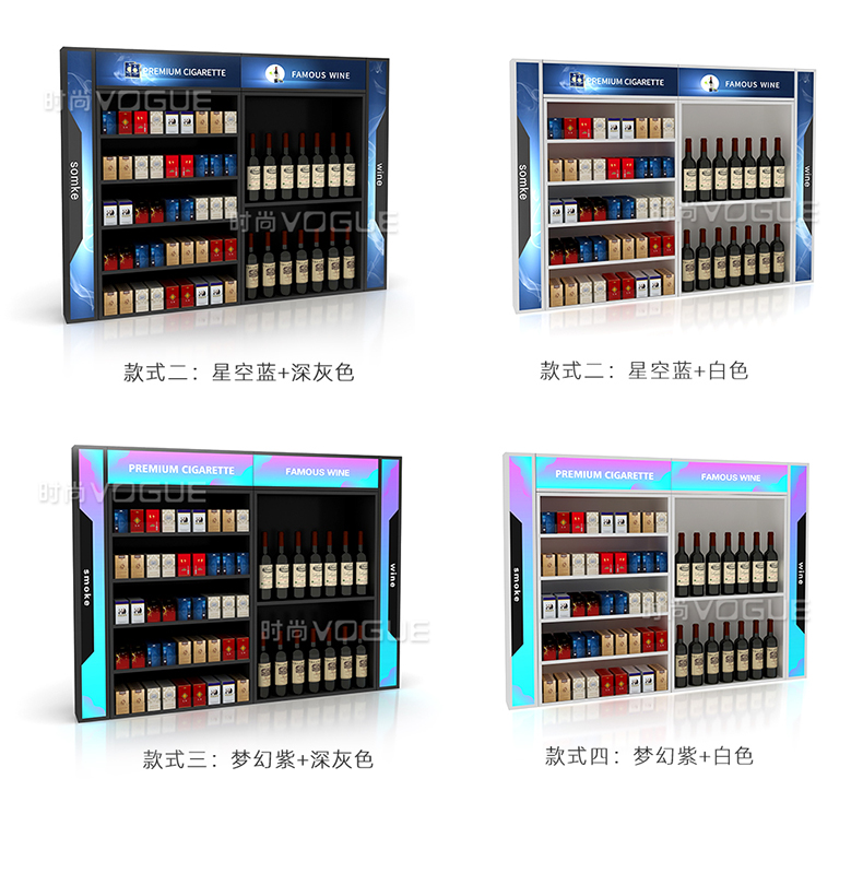 收銀臺紅酒架組合而成。便利店煙酒架立柱采用優質鋼材,具有很好的承重能力。頂部配有磁吸燈箱廣告牌,即可宣傳品牌,又可以指引顧客,讓整個收銀區的工作效率顯著提高。此款收銀區煙酒架是框架式結構,可以直接放置在收銀背柜上,穩定性和安全性很好。